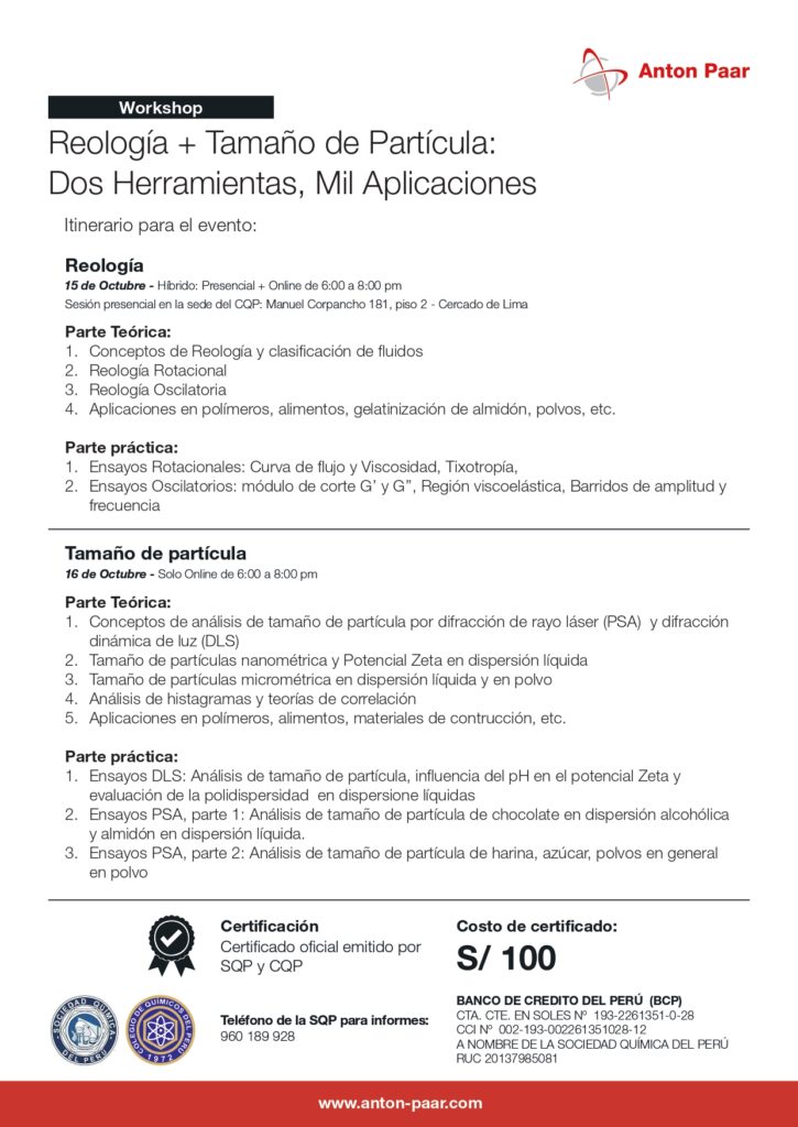 Se invita a participar del workshop en la semana de aniversario de la SQP, organizado por la ๐๐จ๐๐ข๐๐๐๐ ๐๐ฎ๐ขฬ๐ฆ๐ข๐๐ ๐๐๐ฅ ๐๐๐ซ๐ฎฬ (๐๐๐), el ๐๐จ๐ฅ๐๐ ๐ข๐จ ๐๐ ๐๐ฎ๐ขฬ๐ฆ๐ข๐๐จ๐ฌ ๐๐๐ฅ ๐๐๐ซ๐ฎฬ (๐๐๐) y la empresa ๐๐ง๐ญ๐จ๐ง ๐๐๐๐ซ.